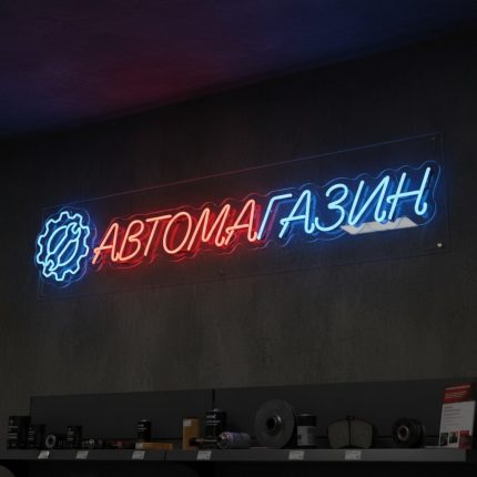 Неоновая вывеска «АВТОМАГАЗИН» с красно-синей подсветкой для магазина