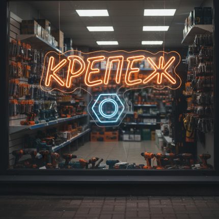Неоновая вывеска «КРЕПЁЖ» с оранжево-голубой подсветкой и изображением гайки
