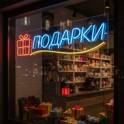 Неоновая вывеска «ПОДАРКИ» с коробкой — сине-красно-жёлтый LED-неон для витрин и магазинов