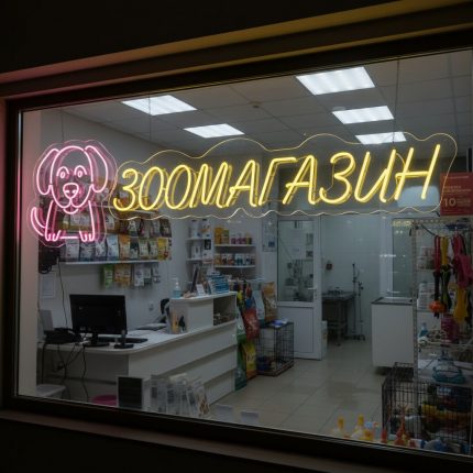 Неоновая вывеска «ЗООМАГАЗИН» с собакой и жёлтой подсветкой
