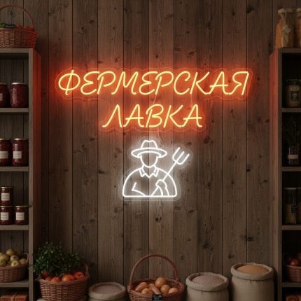 Неоновая вывеска «Фермерская лавка» с фермером — оранжево-белый LED-неон для магазинов натуральных продуктов