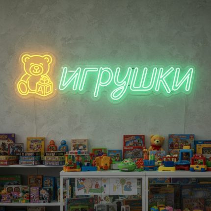Неоновая вывеска «ИГРУШКИ» с изображением медвежонка и зелёно-жёлтой подсветкой