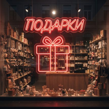 Неоновая вывеска «ПОДАРКИ» с коробкой — красный LED-неон для витрин и магазинов