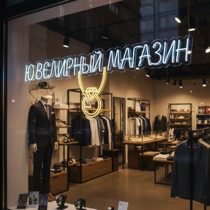 Неоновая вывеска «Ювелирный магазин» с кольцом и бриллиантом — бело-золотой LED-неон для витрин и салонов украшений