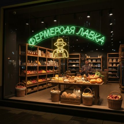 Неоновая вывеска «Фермерская лавка» с изображением фермера — зелёно-жёлтый LED-неон для магазинов натуральных продуктов