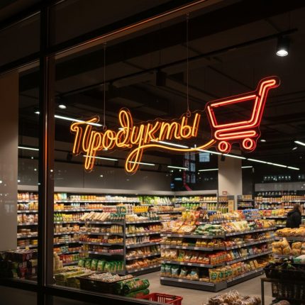 Неоновая вывеска «Продукты» с тележкой — оранжево-красный LED-неон для магазинов и супермаркетов