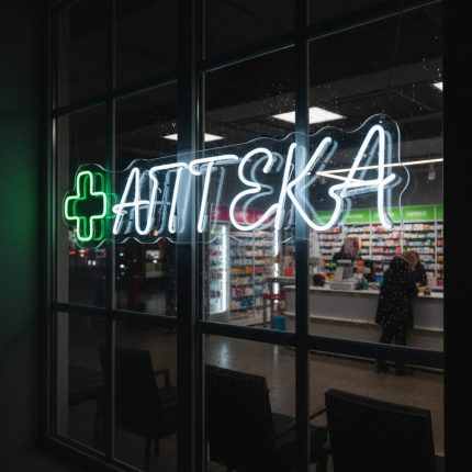 Неоновая вывеска «АПТЕКА» с зелёным крестом и белой подсветкой