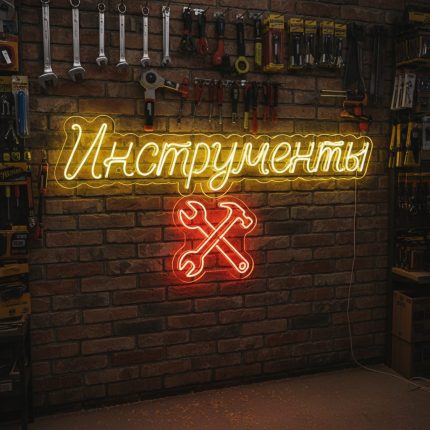Неоновая вывеска «ИНСТРУМЕНТЫ» с ключами и жёлто-красной подсветкой