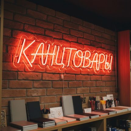 Неоновая вывеска «КАНЦТОВАРЫ» с красной подсветкой
