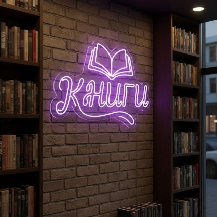 Неоновая вывеска «КНИГИ» с сиреневой подсветкой и контуром открытой книги
