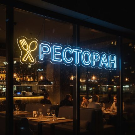 Неоновая вывеска «Ресторан с приборами» синяя с жёлтым акцентом