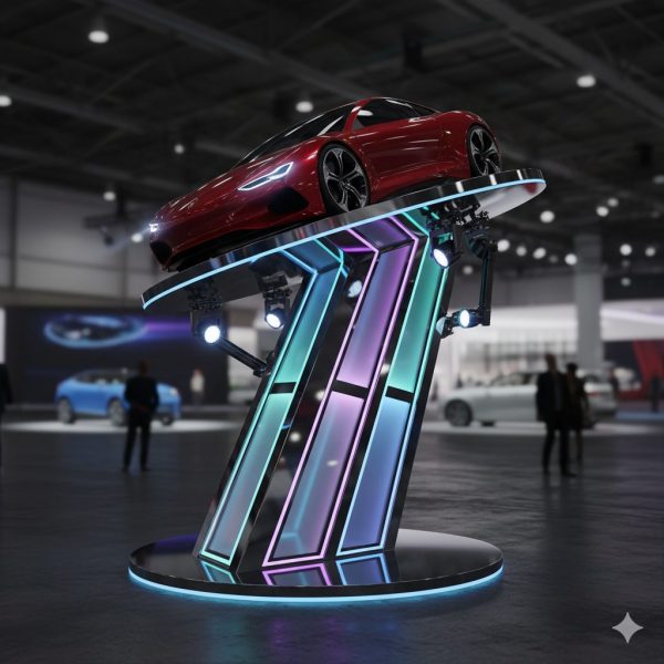 Вращающиеся Подиумы: Оснащены электроприводом, позволяющим автомобилю медленно вращаться на 360 градусов. Это обеспечивает полный обзор автомобиля без необходимости обходить его, создавая динамичный и завораживающий эффект.