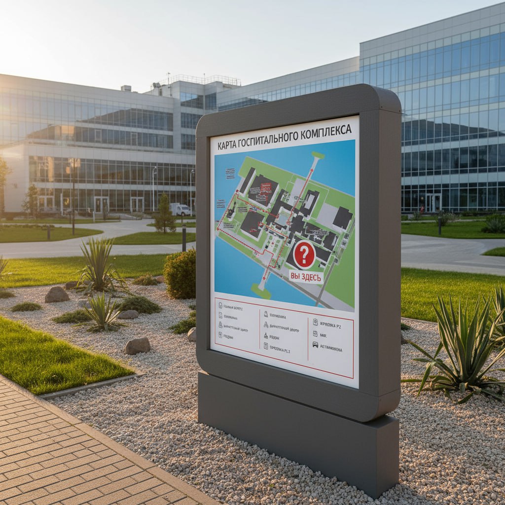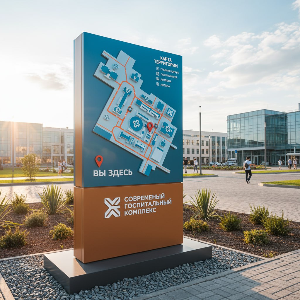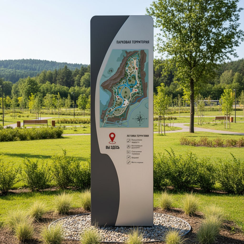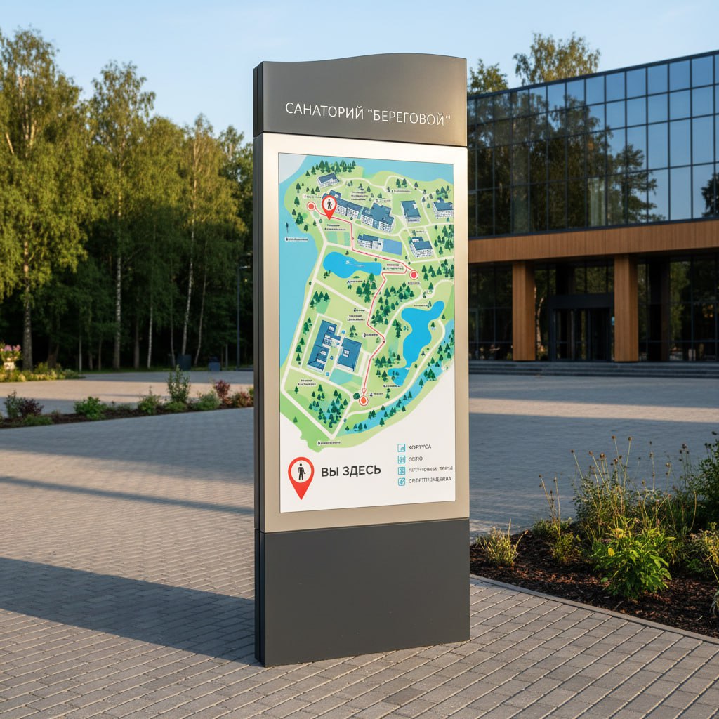 Музеи и Парки: Информационные стенды с картами, выделяющими экспозиции или ключевые объекты.
