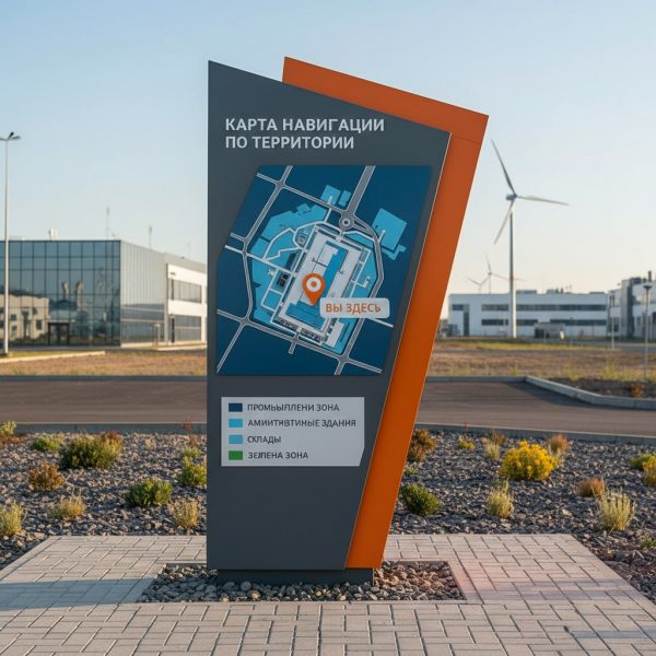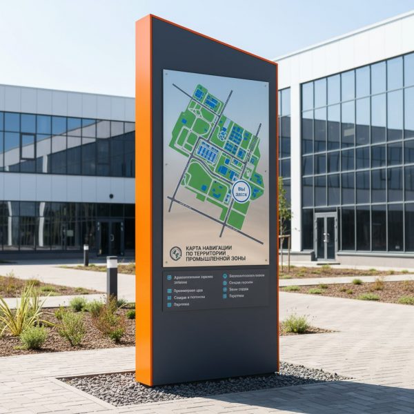 Круглосуточная Доступность и Читаемость: Основное и самое очевидное преимущество. Независимо от времени суток или внешнего освещения, карта с подсветкой всегда остается яркой и легко читаемой. Это идеальное решение для схем эвакуации территории с подсветкой, для навигации на территории предприятия в ночную смену, или для плана жилого комплекса на входе в темное время суток.