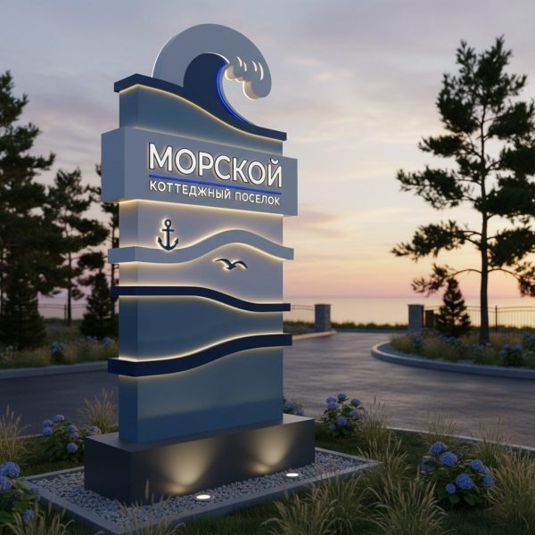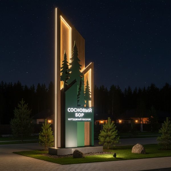 Хорошо выполненная стела работает постоянно и не требует дополнительных инвестиций, оставаясь частью визуального бренда поселка на долгие годы.