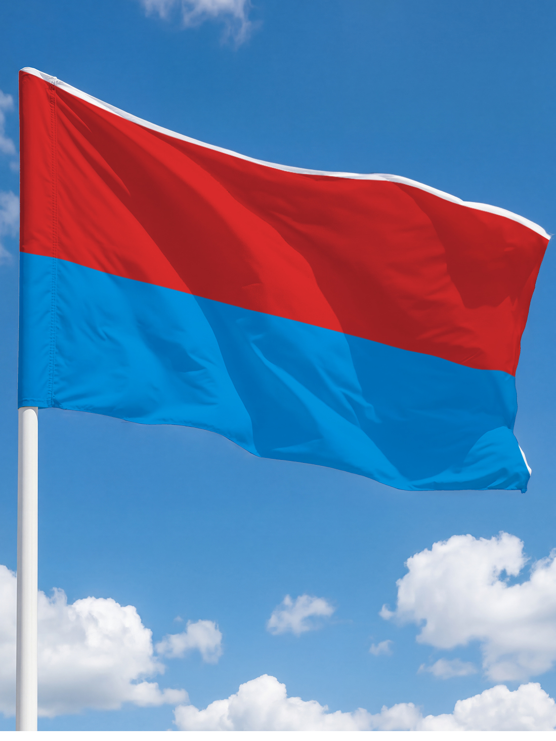 Размер полотна составляет 100×150 см — это стандартный формат, широко используемый для напольных флагштоков, настольных стоек и настенного крепления. Флаг легко размещается в переговорных комнатах, кабинетах руководителей, актовых залах и на выставочных стендах.