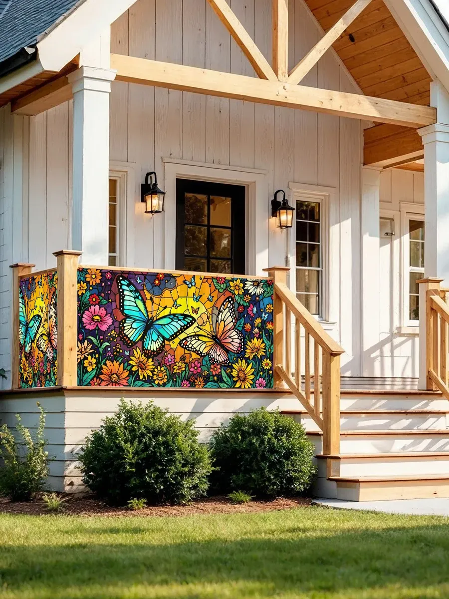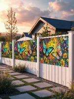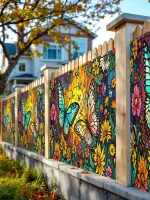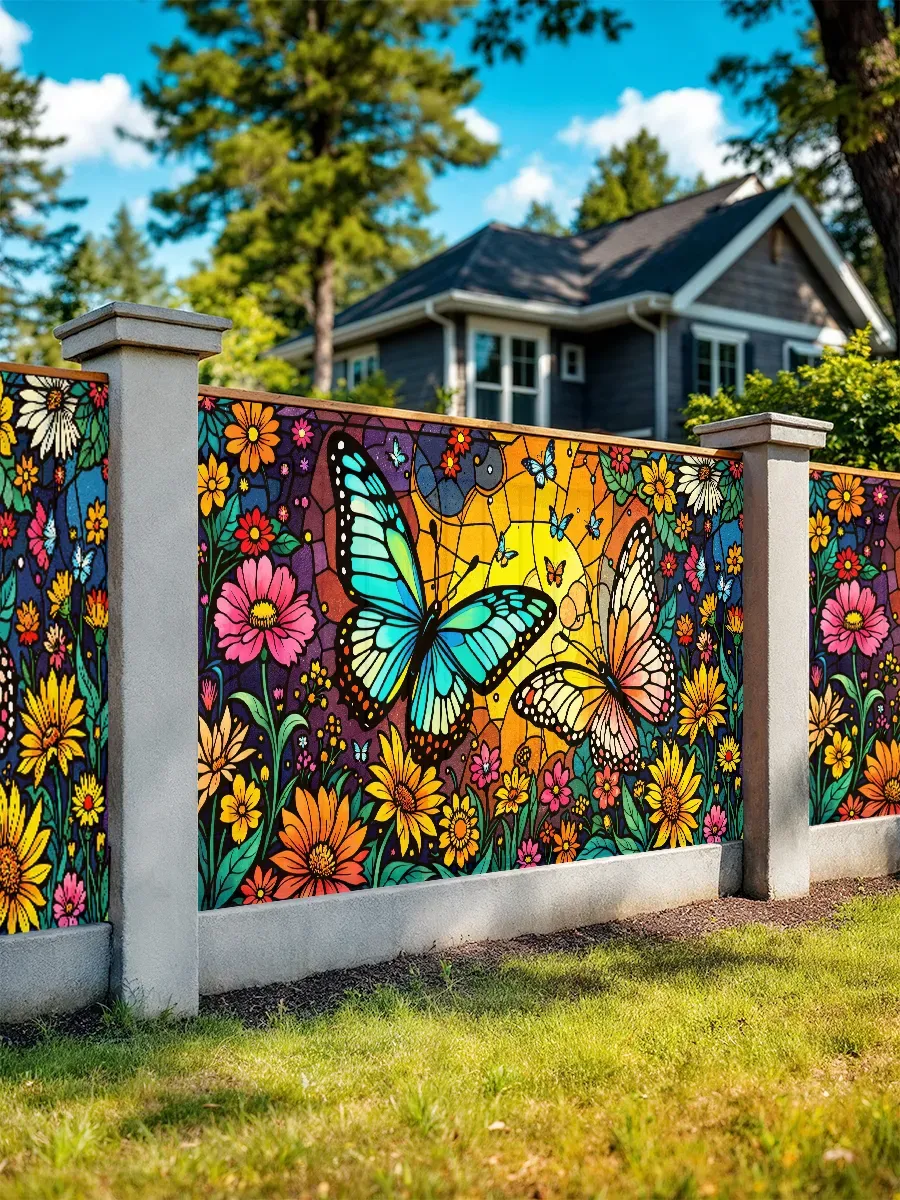 Наша фотосетка «Бабочки и Цветы Витраж» предлагает вам не только впечатляющий декор для забора, но и целый спектр преимуществ: