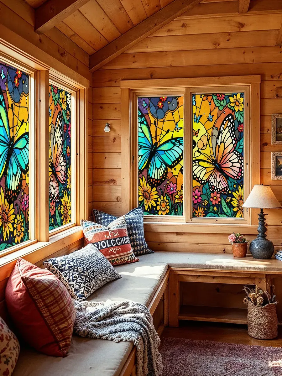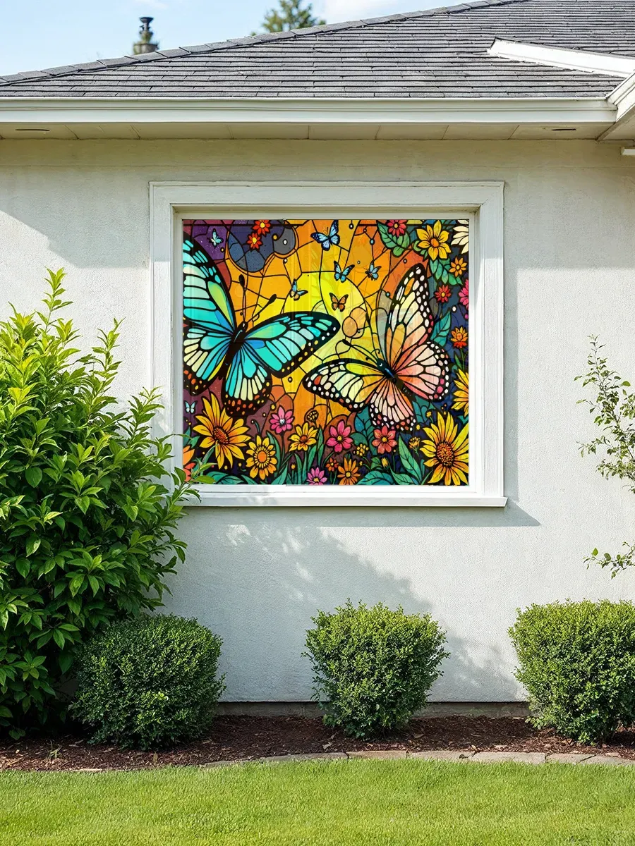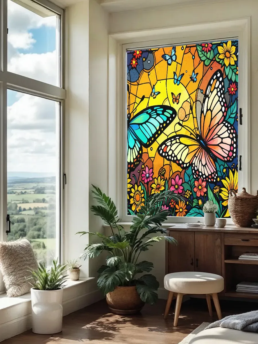 1. Монументальный витражный дизайн: Грандиозные бабочки и пышные цветы, выполненные в ярком витражном стиле, создают потрясающий визуальный эффект на обширной площади. Это гарантирует восхищение и придает вашему пространству исключительную индивидуальность.