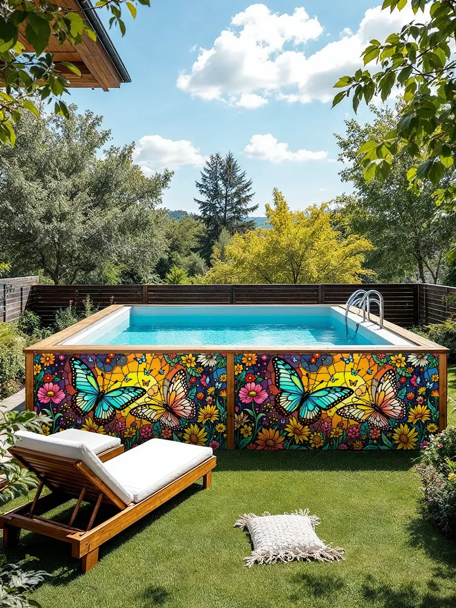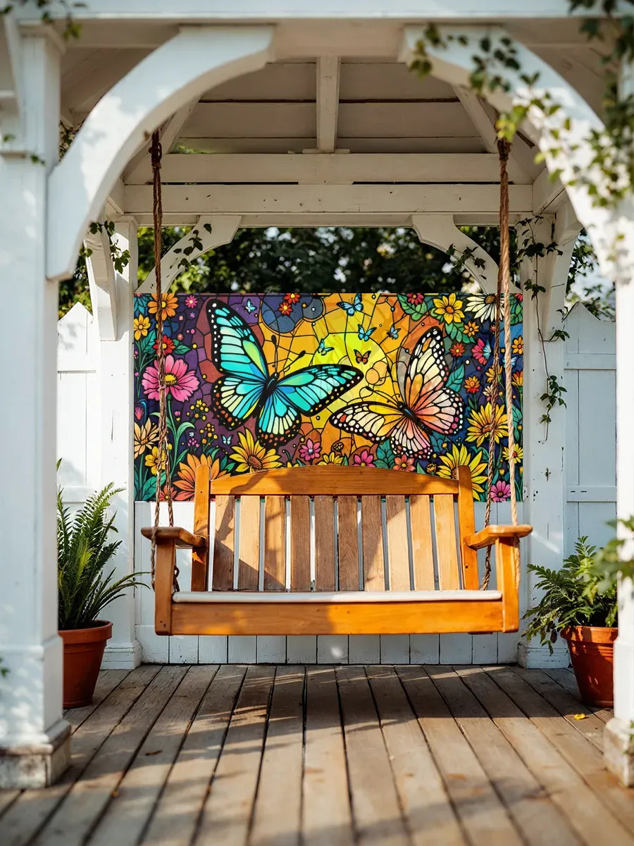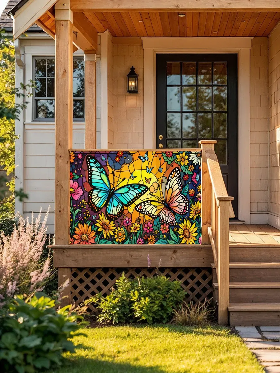 1. Монументальный витражный дизайн: Грандиозные бабочки и пышные цветы, выполненные в ярком витражном стиле, создают потрясающий визуальный эффект на обширной площади. Это гарантирует восхищение и придает вашему пространству исключительную индивидуальность.