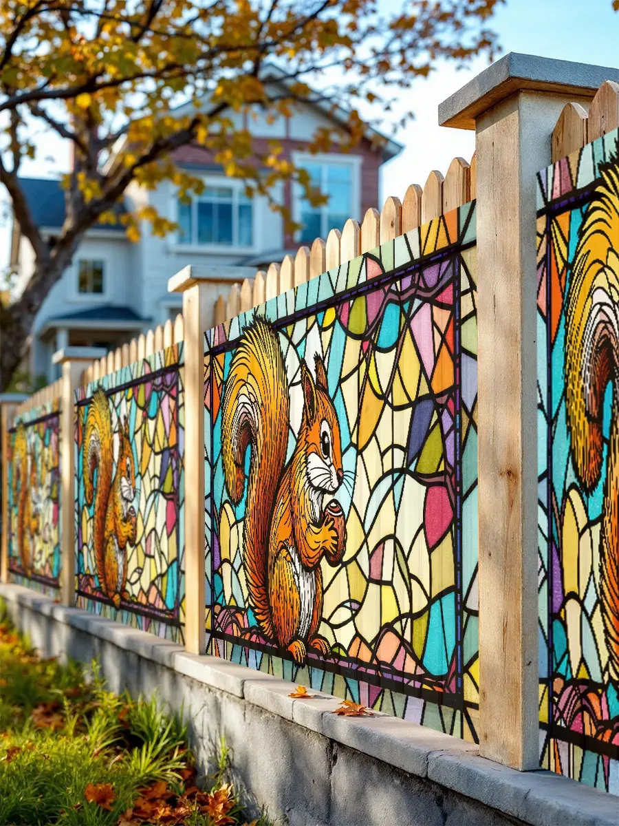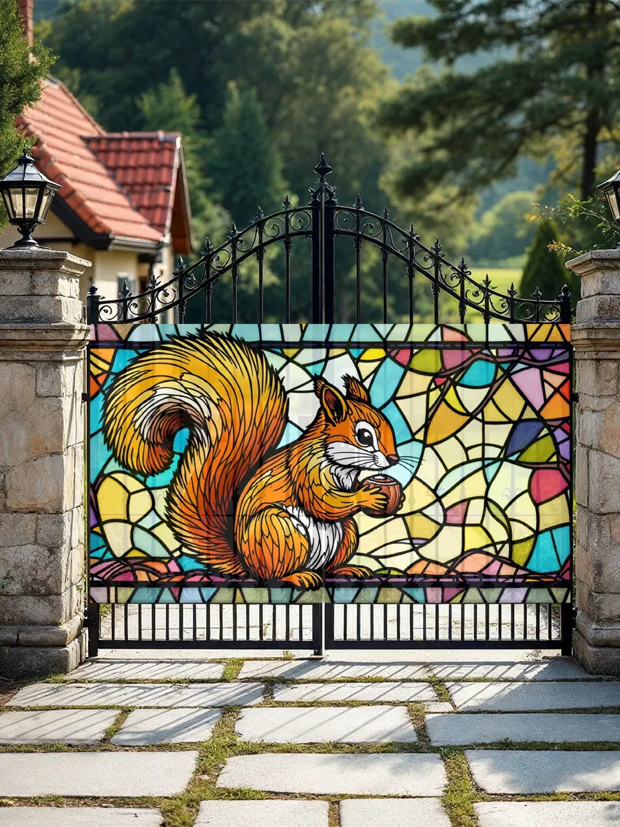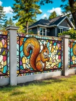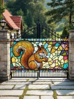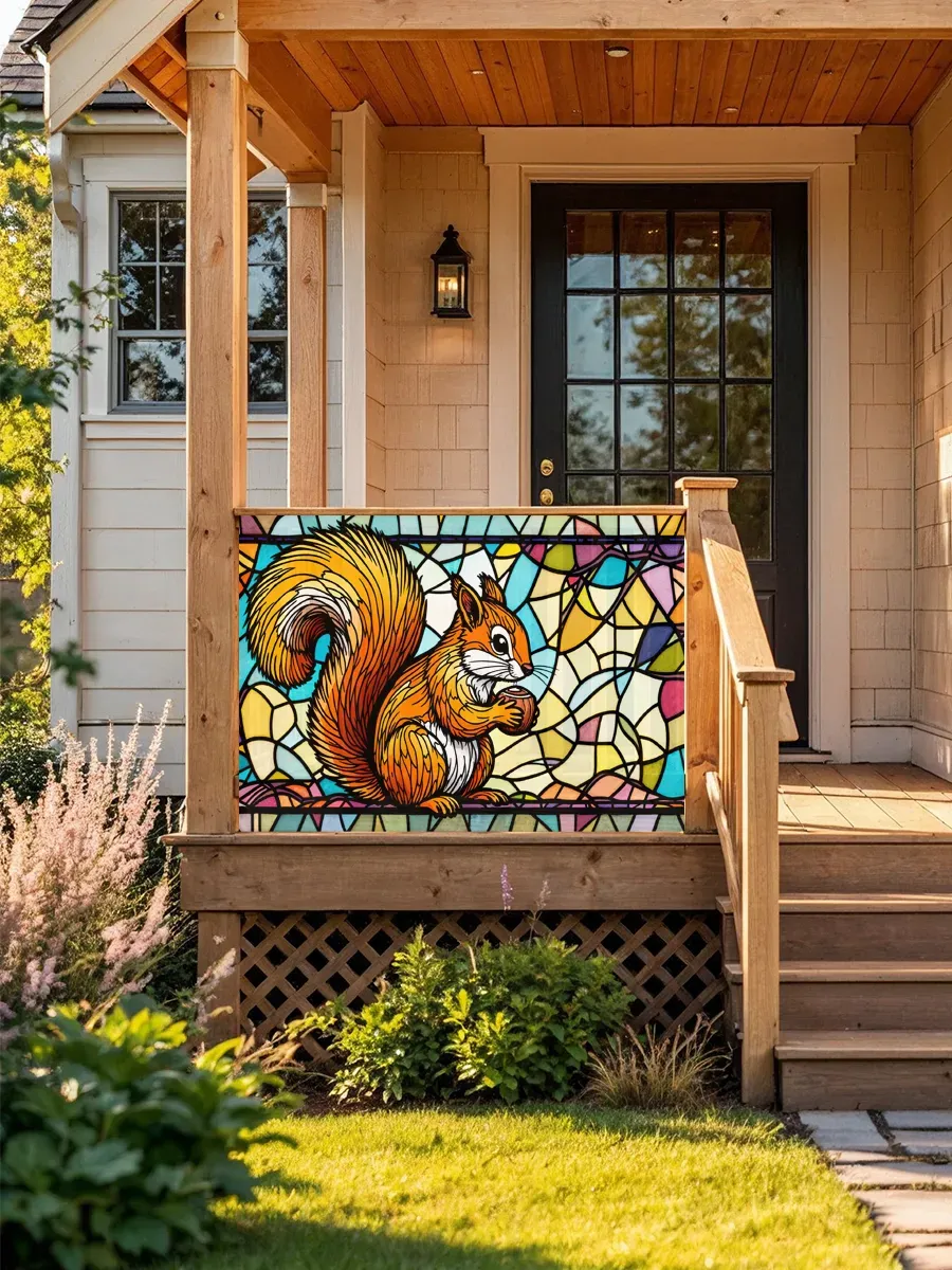 • Фотосетка для дачи и сада: Создайте масштабный уголок лесной сказки, где каждый день вас будет встречать милая белочка на фоне яркого витража, придавая пространству неповторимое очарование.