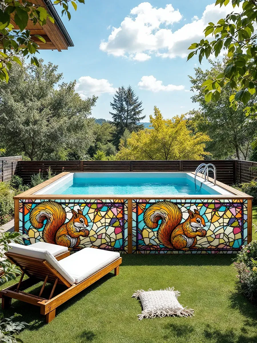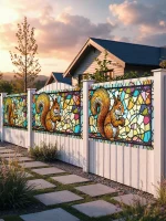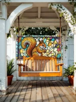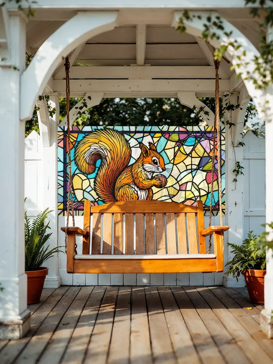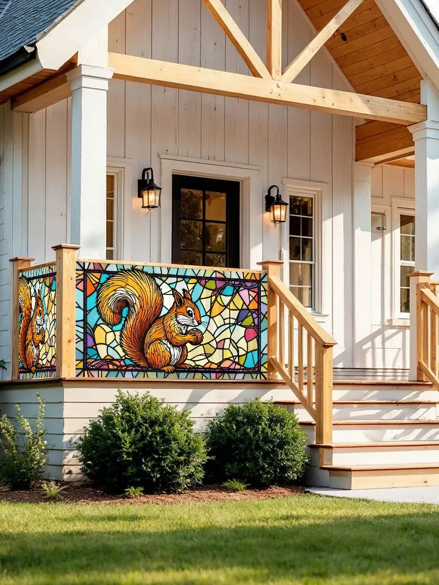 • Фотосетка для дачи и сада: Создайте масштабный уголок лесной сказки, где каждый день вас будет встречать милая белочка на фоне яркого витража, придавая пространству неповторимое очарование.