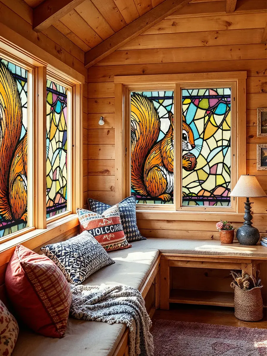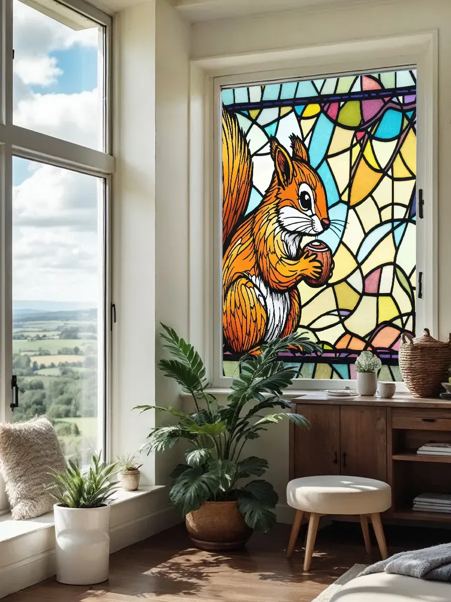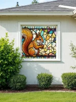 1. Масштабный витражный дизайн с очаровательной белкой: Монументальное изображение милой белки на фоне яркого, словно светящегося витража, создает потрясающий визуальный эффект на обширной площади. Это гарантирует восхищение и придает вашему пространству исключительную индивидуальность и сказочный шарм.