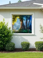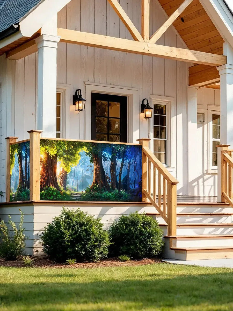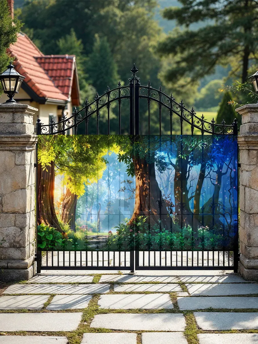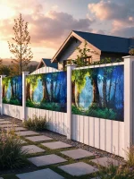 Наш фотофасад «Магический Лес» перенесет вас в мир, где природа оживает в ярких красках и мерцающих лучах. Изображение могучих деревьев, пронизанных золотистым светом с одной стороны и окутанных таинственным синим полумраком с другой, создает эффект невероятной глубины и динамики, максимально расширяя визуальные границы вашего участка. Такая фотосетка для забора не просто украшает, она создает иллюзию сказочного мира прямо за вашей оградой, даря ощущение чуда и загадки. Контраст света и тени, ярких золотистых и глубоких синих оттенков делает этот дизайн по-настоящему уникальным и притягательным, а увеличенный размер 3 х 1,5 м позволяет создать более масштабное и захватывающее зрелище, идеально подходящее для протяженных участков забора или больших открытых пространств.