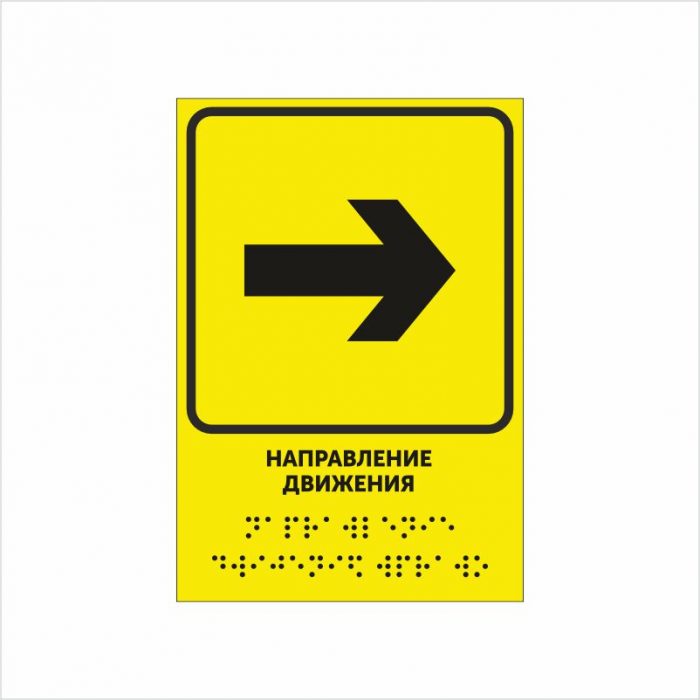 Табличка выполнена на жёлтом фоне с контрастной чёрной стрелкой, указывающей поворот направо. Под пиктограммой нанесена надпись «НАПРАВЛЕНИЕ ДВИЖЕНИЯ», продублированная шрифтом Брайля. Рельефное исполнение обеспечивает удобство восприятия информации как визуально, так и на ощупь.