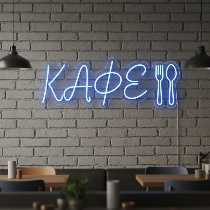 Яркая неоновая вывеска «Кафе с приборами» в синем свечении станет выразительным элементом оформления фасада или интерьера заведения. Мягкий холодный свет подчёркивает современный стиль и создаёт атмосферу уюта. Благодаря лаконичной форме и чистому свечению вывеска гармонично впишется как в дизайн кофейни, так и в оформление ресторана или бистро.