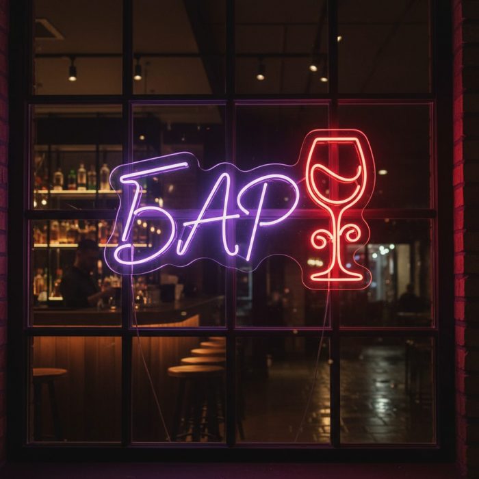 Неоновая вывеска “Бар с бокалом вина” — это идеальное сочетание эстетики и функциональности.
