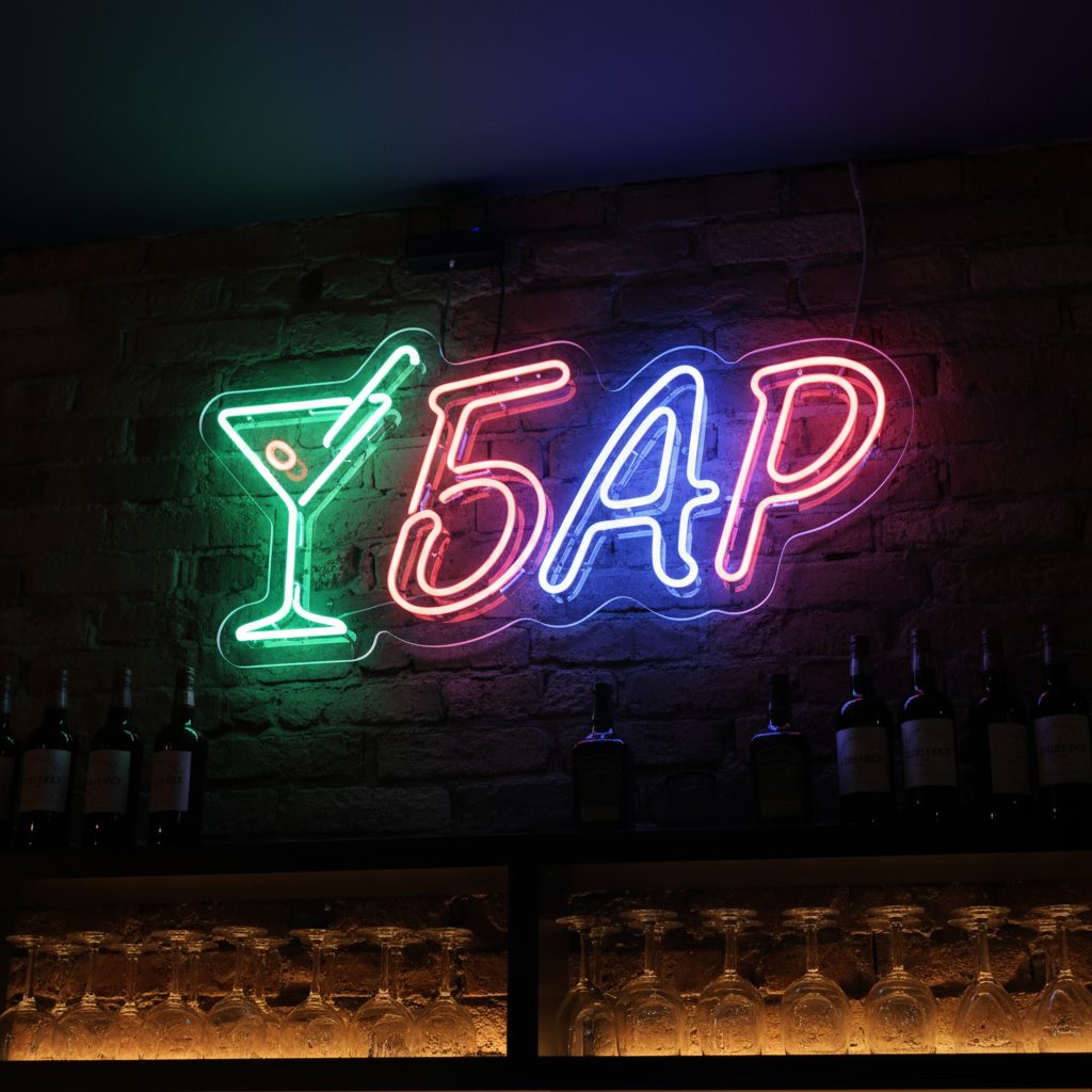 Создайте настроение праздника и уюта с помощью неоновой вывески “Бар с бокалом”.