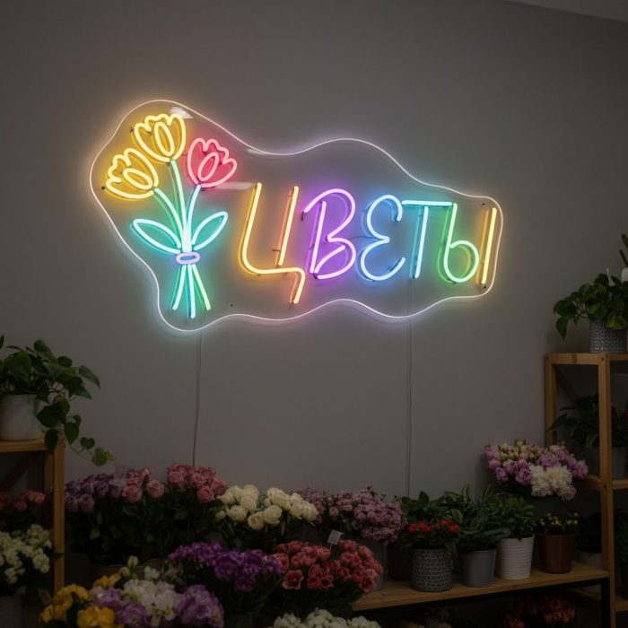 Неоновая вывеска «Цветы с букетом тюльпанов» — это не просто источник света, а элемент фирменного стиля, создающий настроение и повышающий узнаваемость бренда.