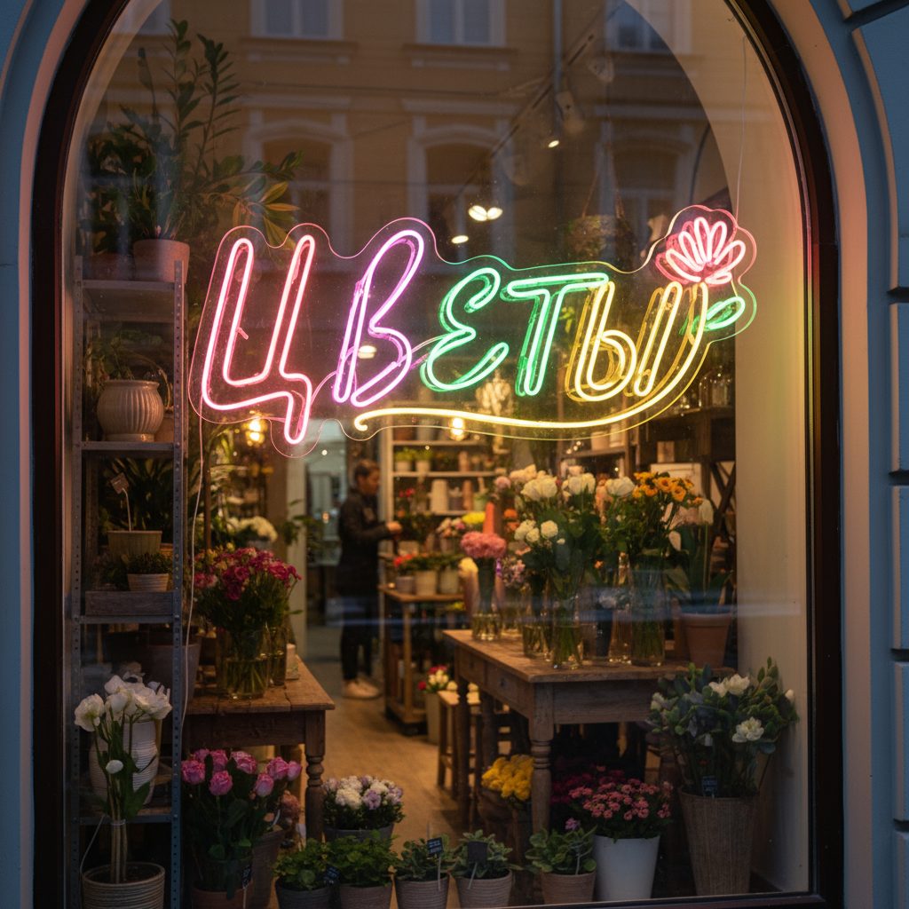 Композиция вывески представляет собой надпись «Цветы», выполненную в жёлто-розовых и зелёных неоновых тонах, с аккуратным бутоном в виде миниатюрного цветка.