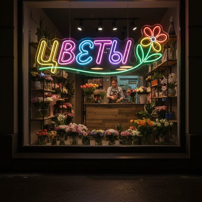 Вывеска смотрится эффектно как днём, так и вечером: она создаёт мягкое, притягательное свечение, подчёркивающее эстетику живых цветов за стеклом.