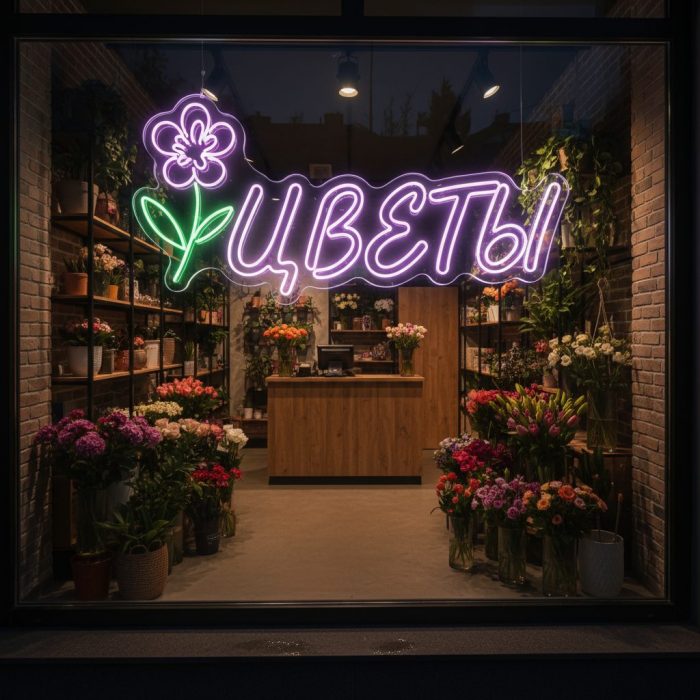 Дизайн вывески сочетает плавный рукописный шрифт слова «Цветы» с крупным неоновым цветком слева.