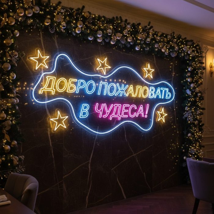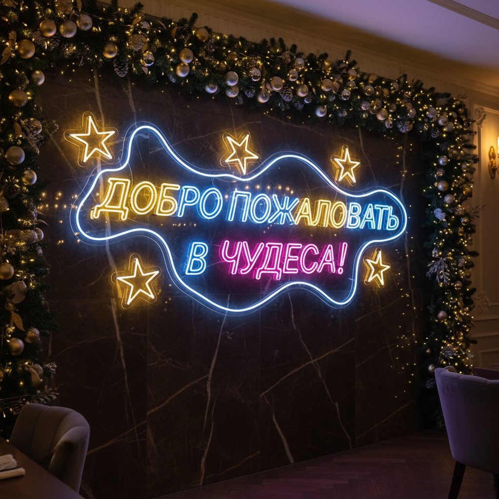 Неоновая вывеска «Добро пожаловать в чудеса!» — это универсальный элемент декора, который задаёт настроение с первой секунды.