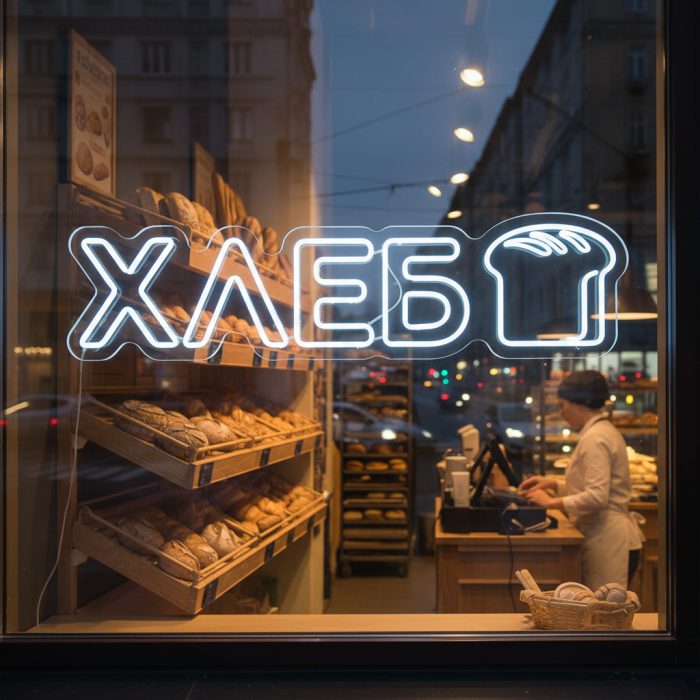 Неоновая вывеска «Хлеб» — современное и лаконичное решение для витрины или фасада пекарни. Белое холодное свечение подчёркивает чистоту и свежесть продукта, визуально выделяя заведение даже в дневное время.