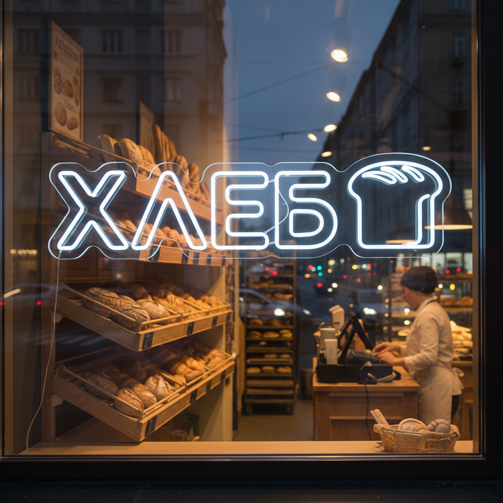 Неоновая вывеска «Хлеб» с белым холодным свечением