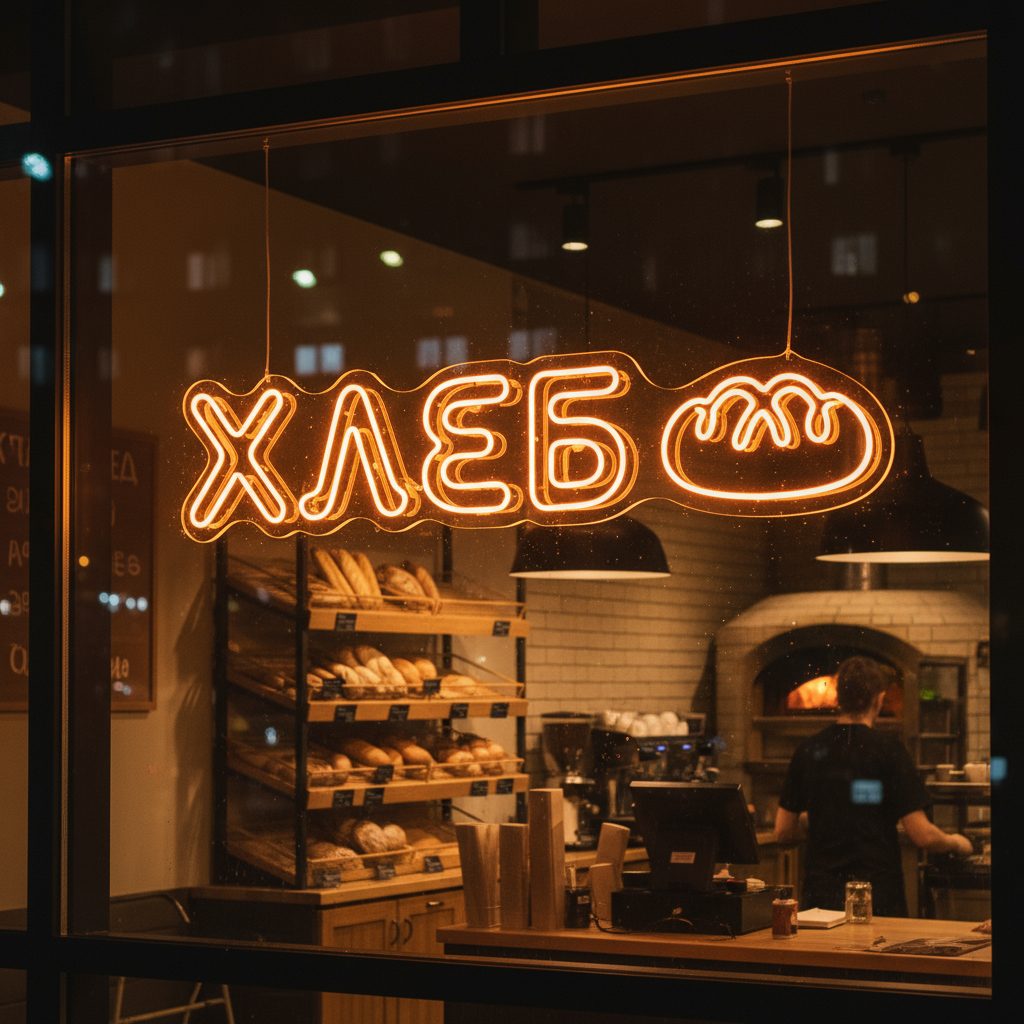 Неоновая вывеска «Хлеб» с тёплым янтарным свечением