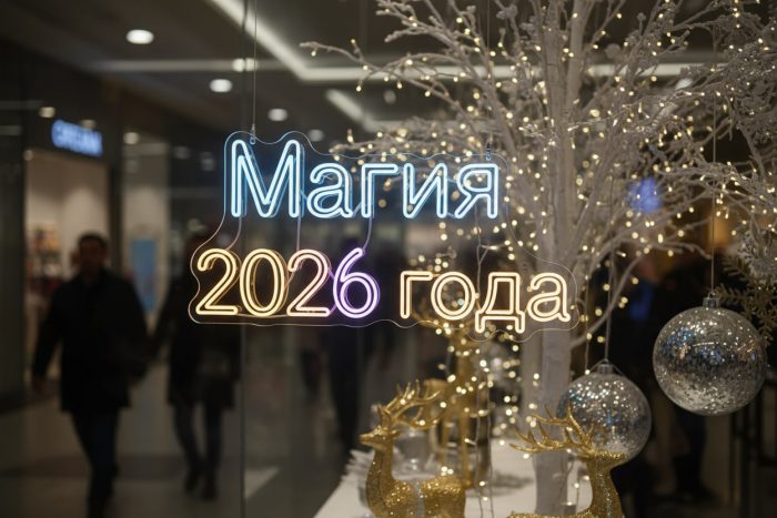 Вывеска “Магия 2026 года” отлично сочетается с гирляндами, зеркалами и зимним декором, усиливая эффект волшебства.