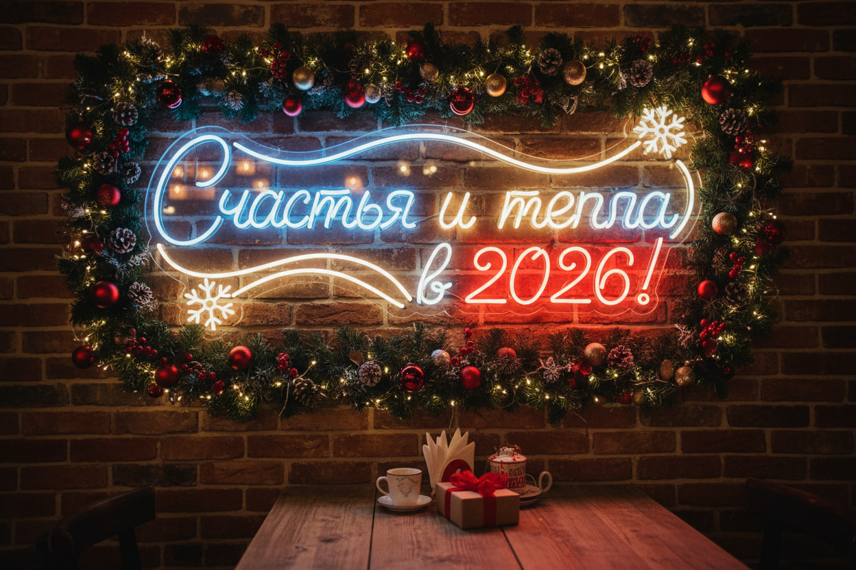 Создайте атмосферу уюта, радости и праздничного волшебства с неоновой вывеской «Счастья и тепла в 2026!».