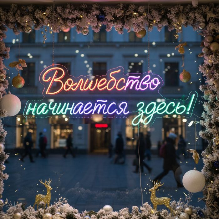 Неоновая вывеска «Волшебство начинается здесь!» создаёт атмосферу сказки, света и вдохновения.