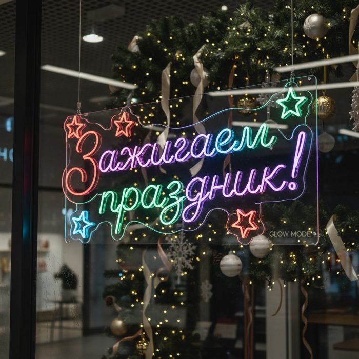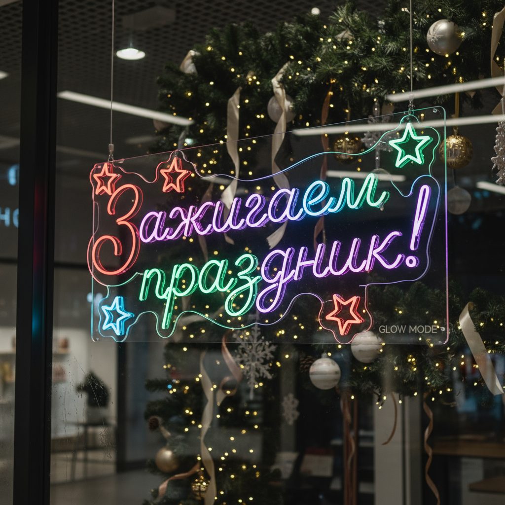 Неоновая вывеска “Зажигаем праздник!” мгновенно создаёт эффект присутствия праздника — словно всё вокруг наполняется теплом и энергией.