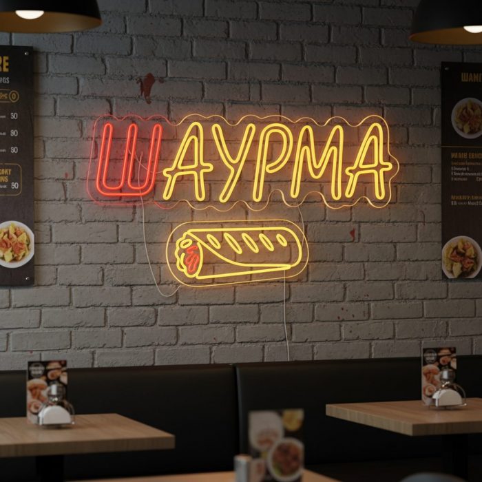 Неоновая вывеска «Шаурма» — это не просто подсветка, а инструмент, который работает на ваш бренд, усиливает поток клиентов и создаёт атмосферу настоящего вкуса и уюта.