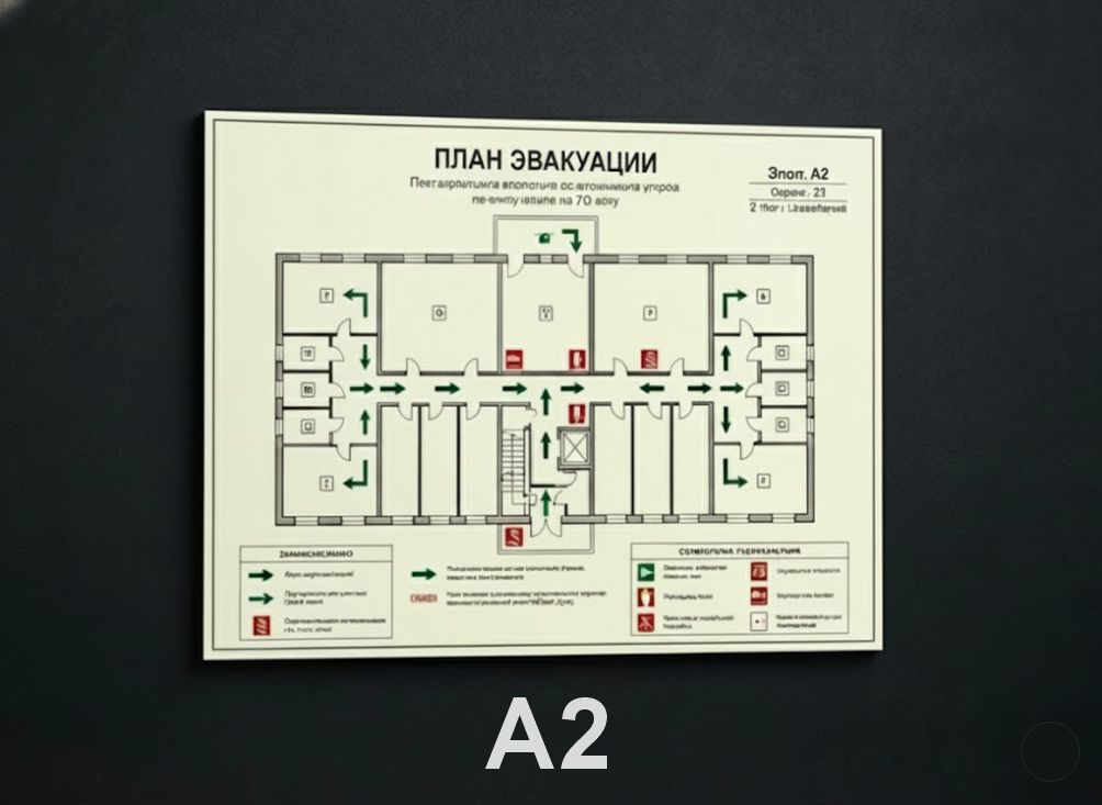 Данное изделие представляет собой схему, напечатанную на сертифицированной фотолюминесцентной пленке увеличенного формата. Размер А2 обеспечивает высокую детализацию маршрутов и читаемость символов с большего расстояния, что критически важно в просторных коридорах и холлах. Товар полностью готов к эксплуатации и проверкам надзорными органами (МЧС).