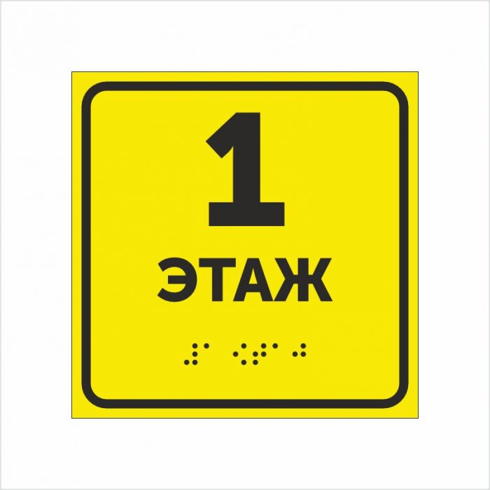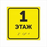 Табличка выполнена на жёлтом фоне с контрастной чёрной надписью “1 ЭТАЖ”, продублированной шрифтом Брайля.