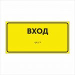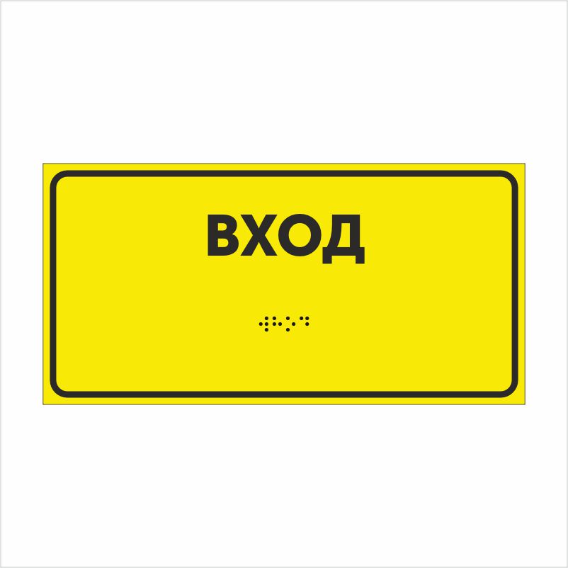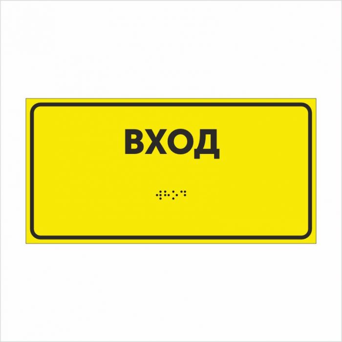 Изделие выполнено на жёлтом фоне с контрастной чёрной надписью “ВХОД”, продублированной шрифтом Брайля.