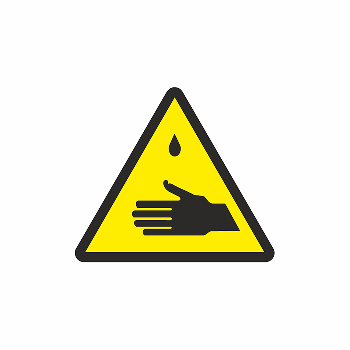Пиктограмма выполнена в традиционном для предупреждающих знаков формате — жёлтый треугольник с чёрной окантовкой. В центре изображена капля, падающая на руку, что символизирует прямой риск химического ожога, раздражения или разрушительного воздействия реагента на кожу. Лаконичная и узнаваемая форма пиктограммы гарантирует её высокую информативность — знак легко понимается сотрудниками, подрядчиками и посетителями независимо от уровня подготовки или языка.