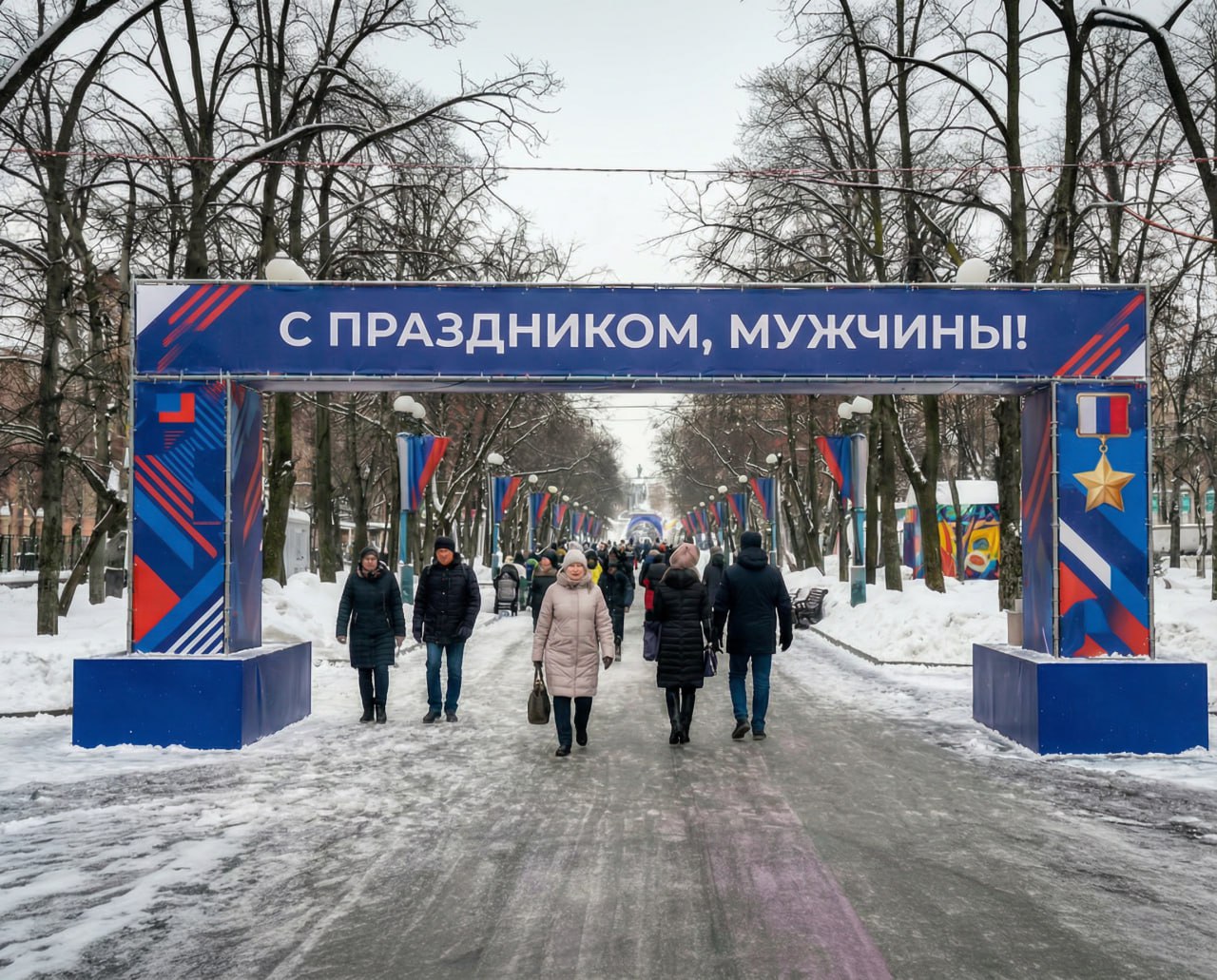 Наша компания предлагает профессиональные услуги по комплексному оформлению к 23 февраля в Москве и Московской области. Мы работаем в двух ключевых направлениях: масштабное украшение городских пространств (парки, площади, улицы) и создание атмосферных декораций для бизнеса (офисы, торговые центры, корпоративные вечеринки).