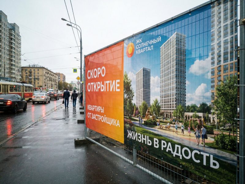Сетка на заборе находится в жестких условиях: снег, реагенты, выхлопные газы, механическое трение о металл. Чтобы реклама прослужила весь цикл стройки, мы уделяем внимание деталям: